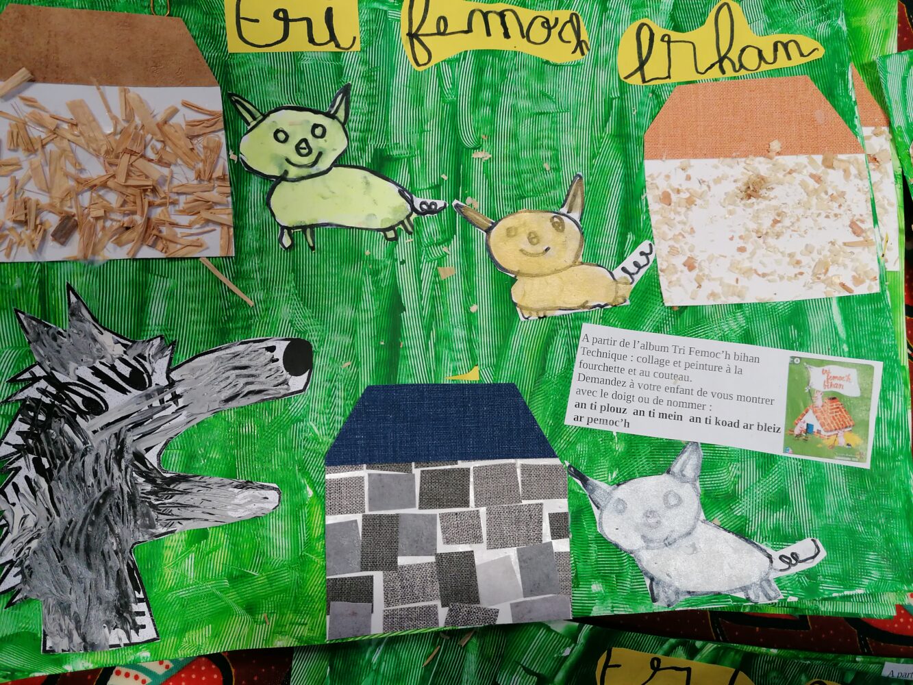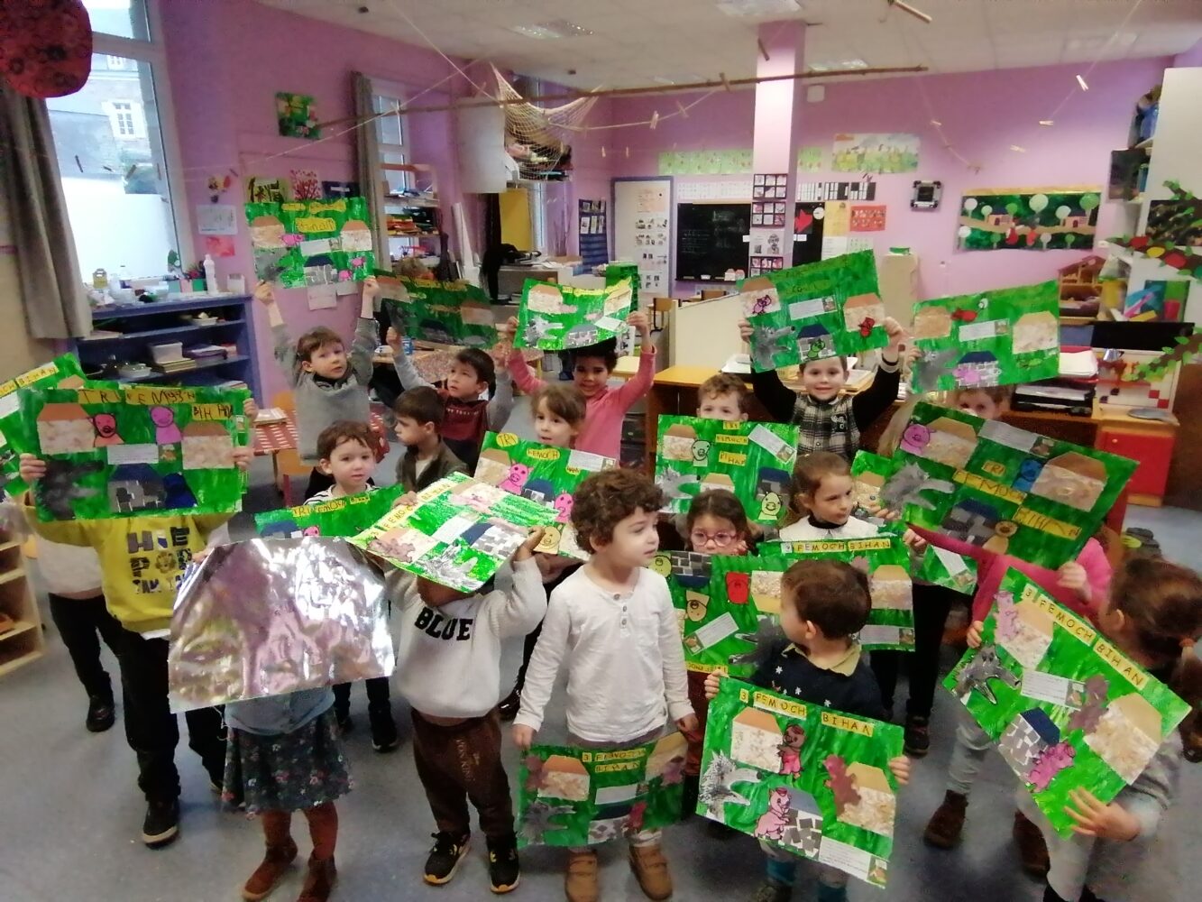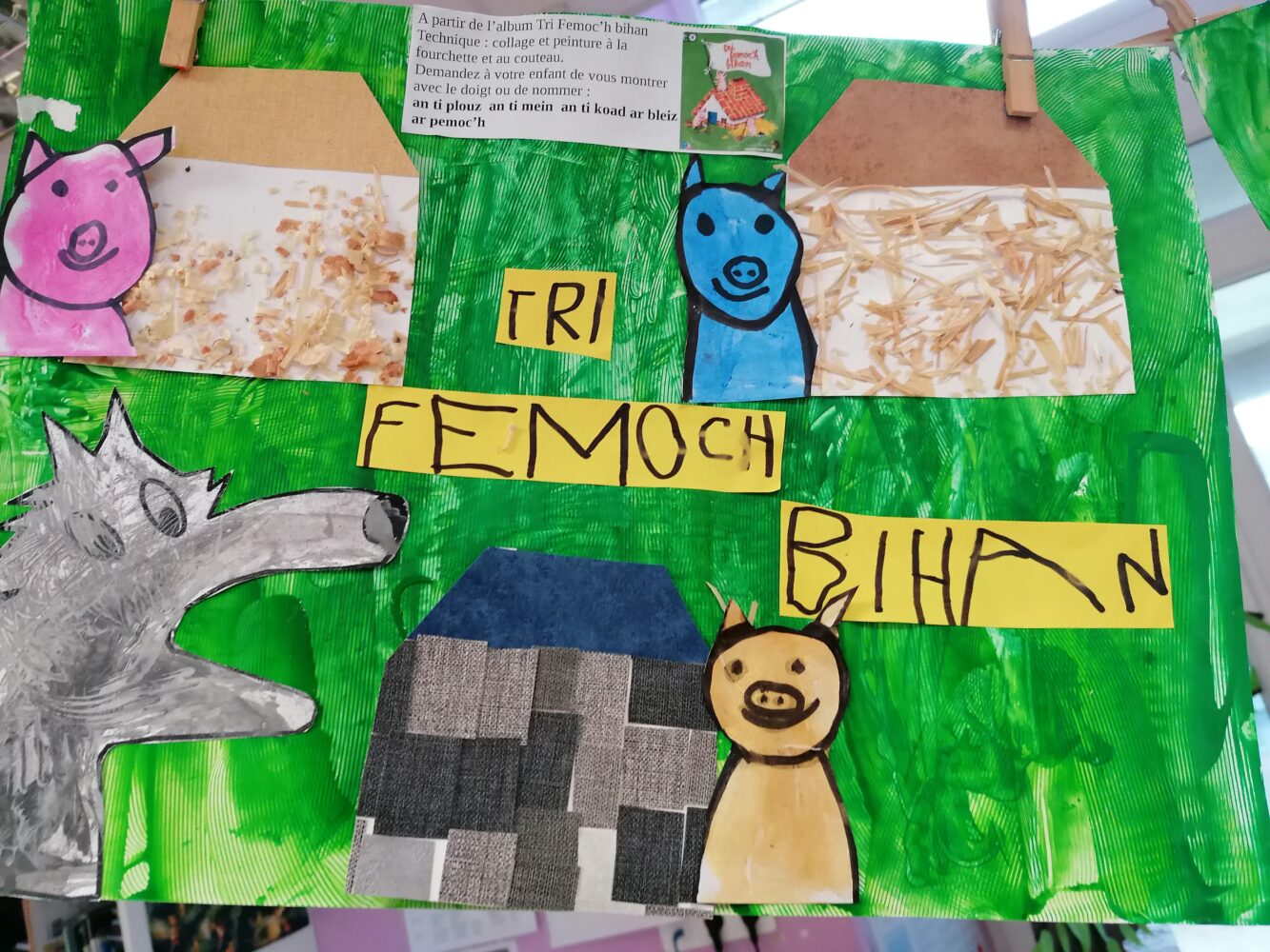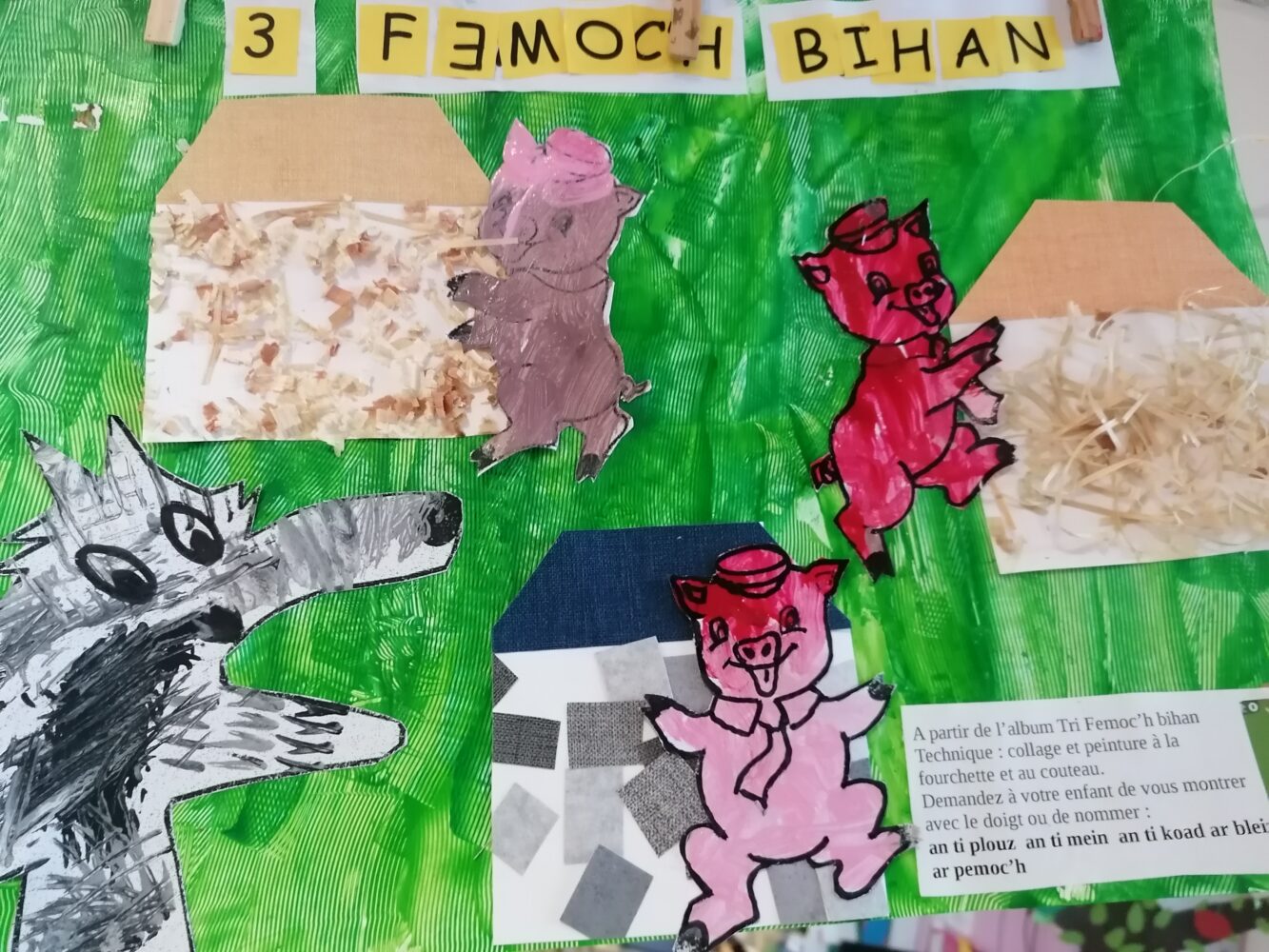 Dans la poursuite de notre projet sur les albums traditionnels, nous avons travaillé sur l’histoire des Trois Petits Cochons durant ces dernières semaines. Au programme: lecture, découverte de différentes versions, peinture, devinettes en breton, peinture, collage, écriture, graphismes, lignes fermée….