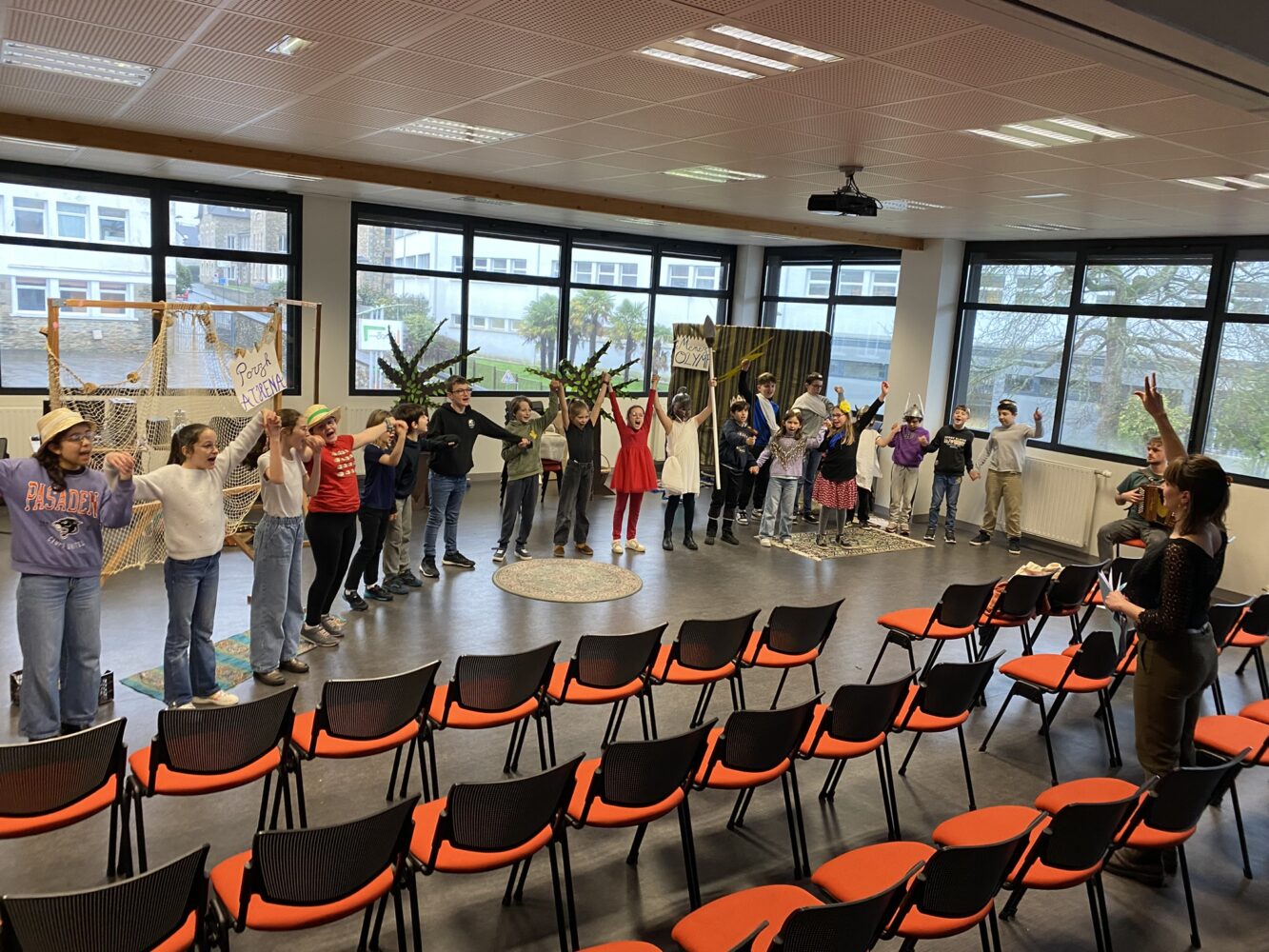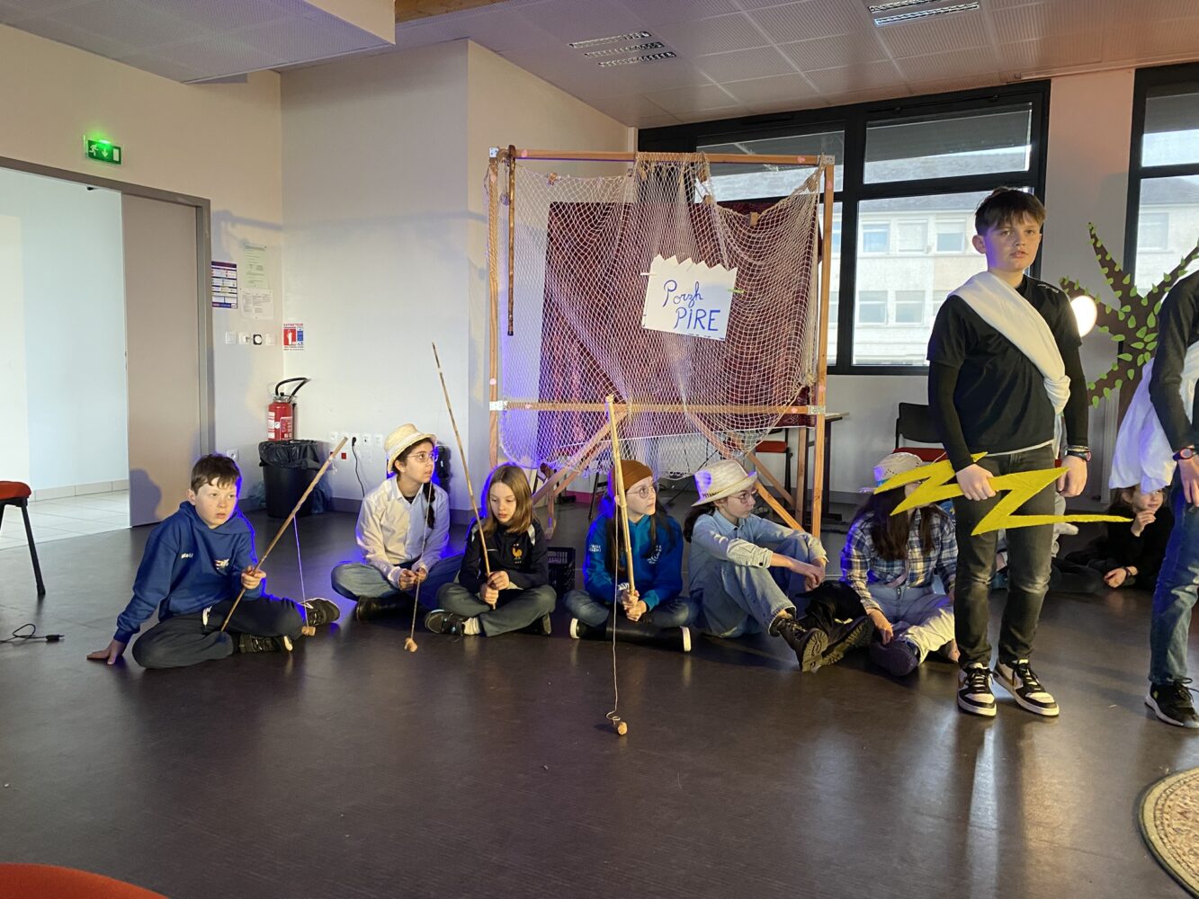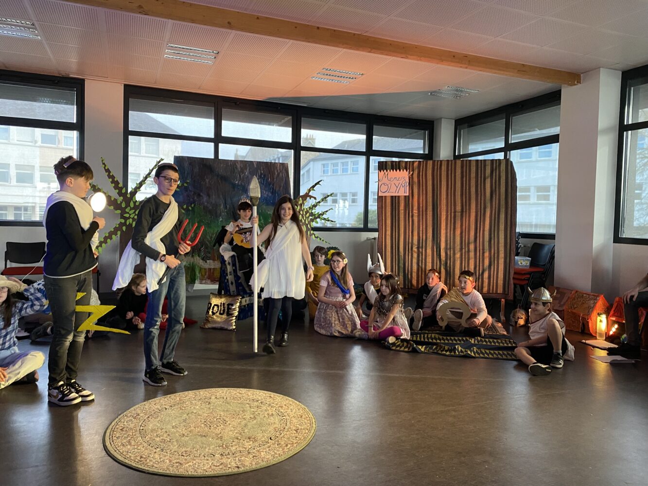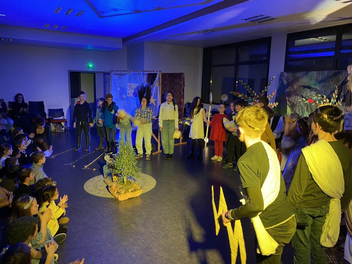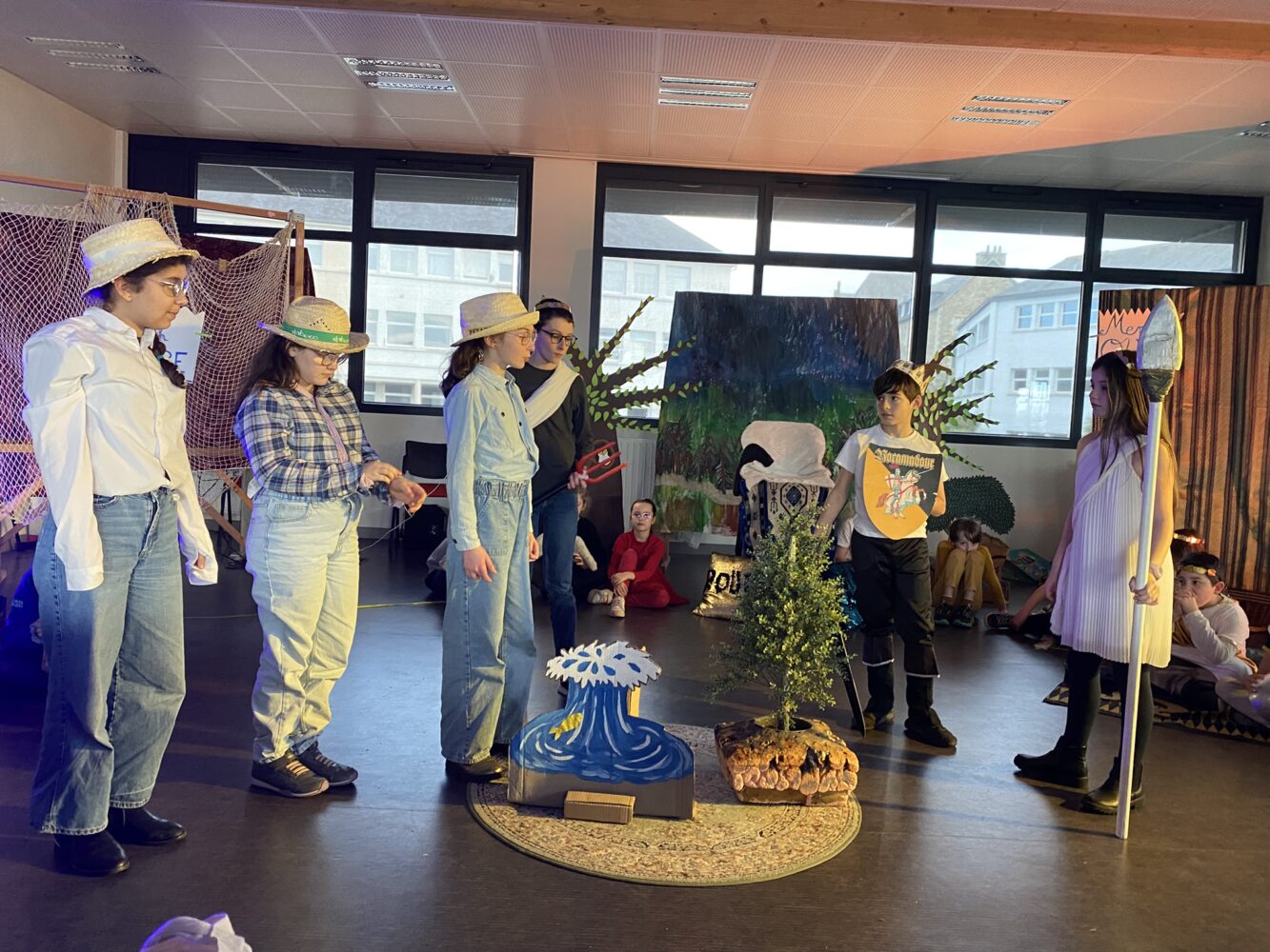 Les élèves de CM1-CM2 de la filière bilingue ont participé à un projet théâtre en breton tout au long de la seconde semaine de janvier. Avec l’aide d’Azénor Kallag, ils ont travaillé leur aisance à l’oral, leurs déplacements dans l’espace et ont préparé une pièce sur le thème de la mythologie : le duel entre Athéna et Poséidon pour devenir protectrice ou protecteur d’Athène. Toute la filière a finalisé le projet lors d’une représentation devant les parents le vendredi soir. Merci à l’association des parents d’élèves bilingues, DIVASKELL, qui a financé ce beau projet.