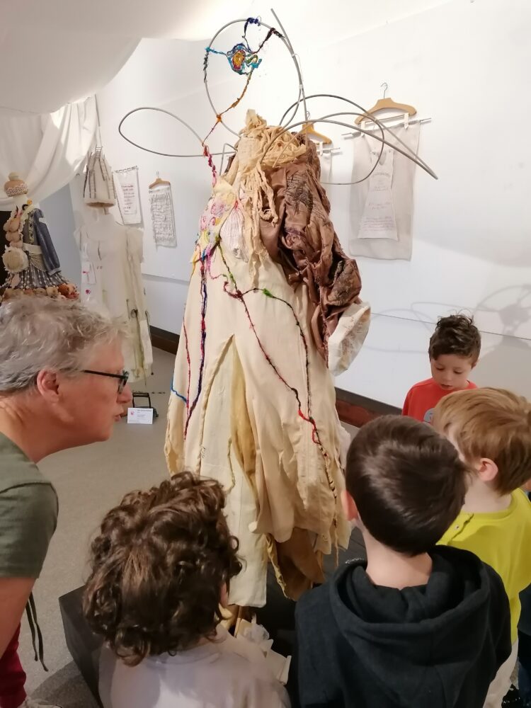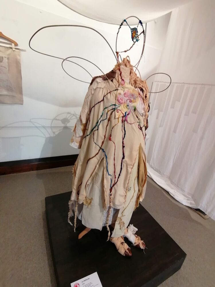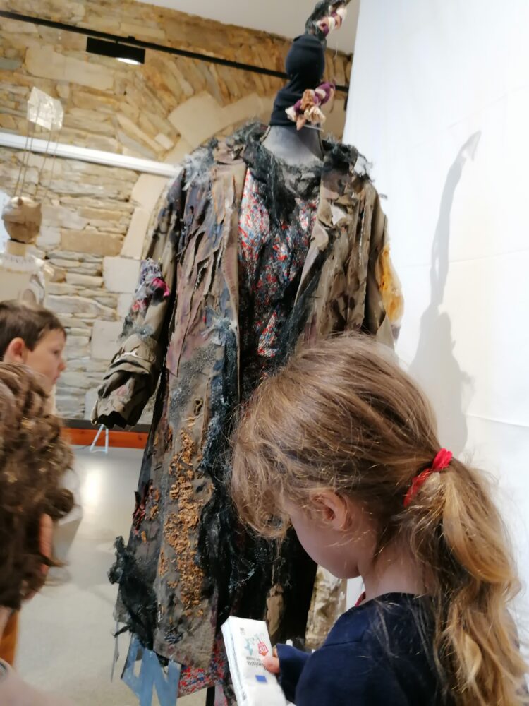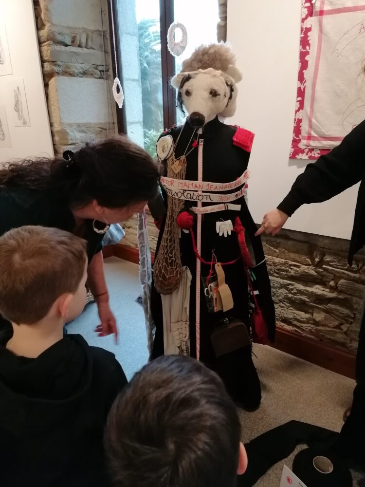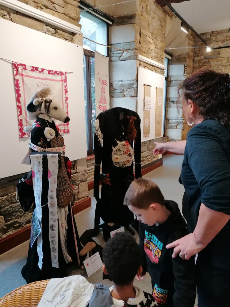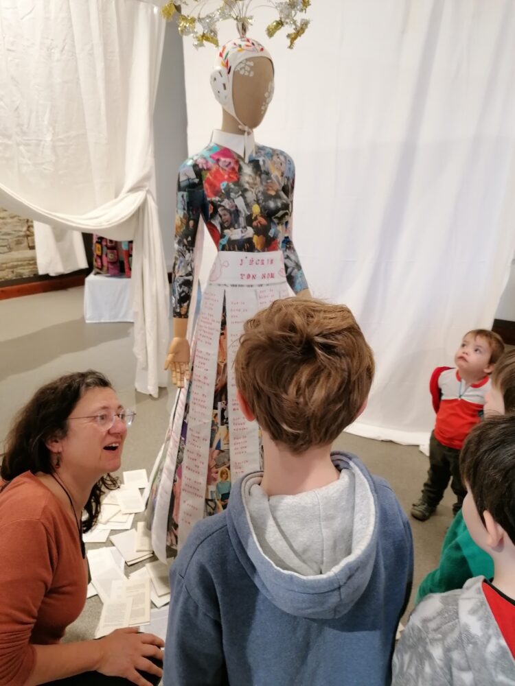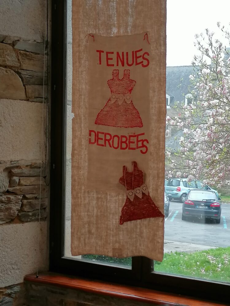 Nous sommes allés à l’atelier des Ursulines afin de visiter l’exposition “Tenues Dérobées”. Nous avons accueillis par Anne-Soaz, Anne-Marie et Muriel. Elles nous ont présenté le travail réalisé par leur collectif. Il s’agit de tenues communicant différents messages, réalisées par 11 femmes.