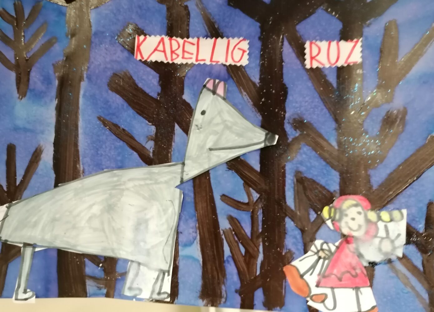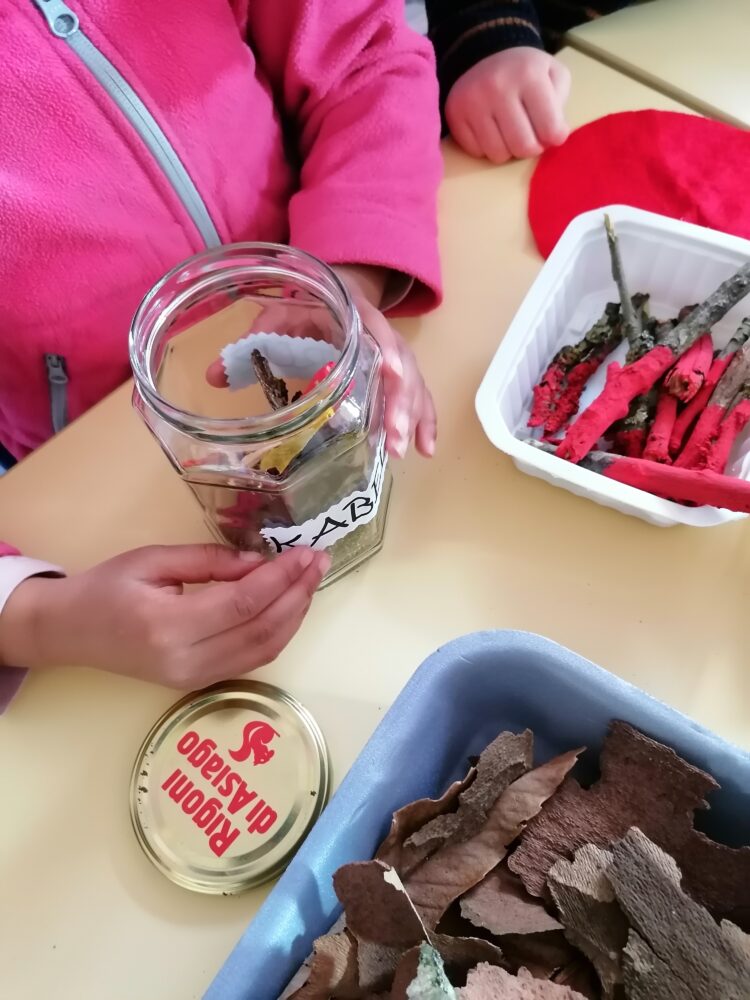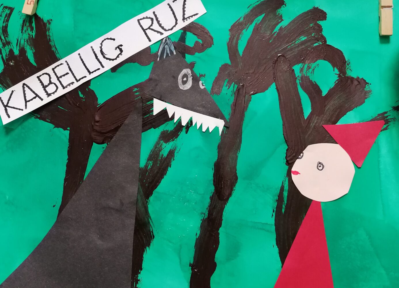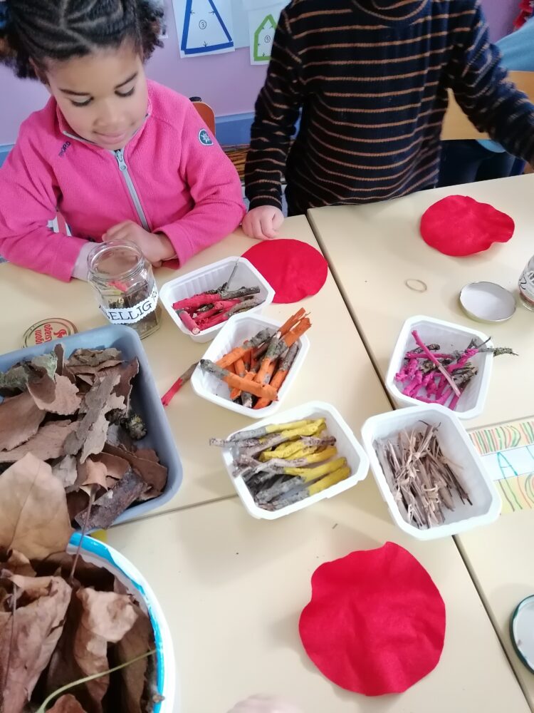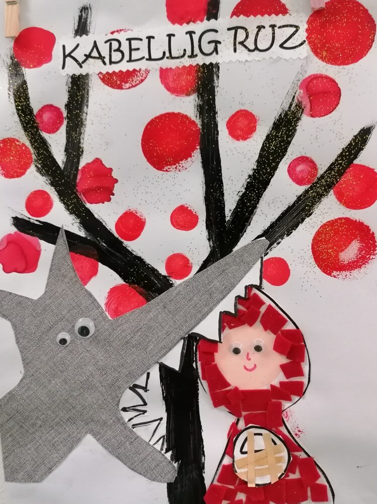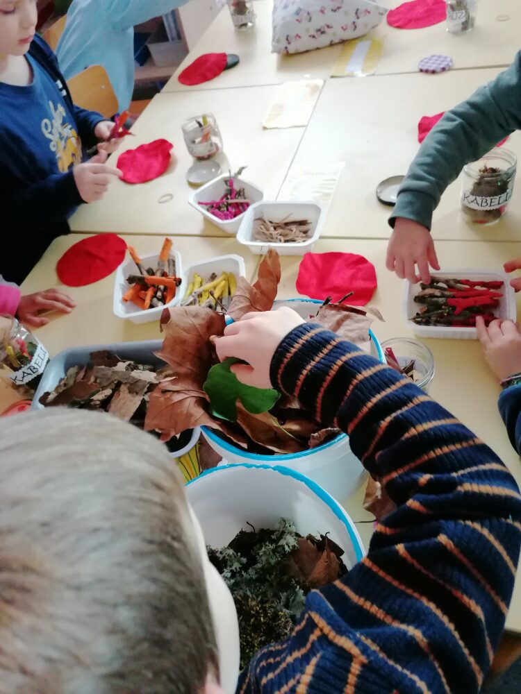 Après avoir lu plusieurs versions de l’histoire du Petit Chaperon Rouge, nous avons mis en scène la notre. Pour ce faire, nous l’avons théâtralisée puis nous sommes allés chercher des éléments de la nature pour la raconter. Chaque enfant est reparti avec son petit bocal à histoire. Nous avons également travaillé sur cette histoire en arts visuels, graphisme et écriture. Nous avons réalisé un support que nous transformons en calendrier de l’Avent.