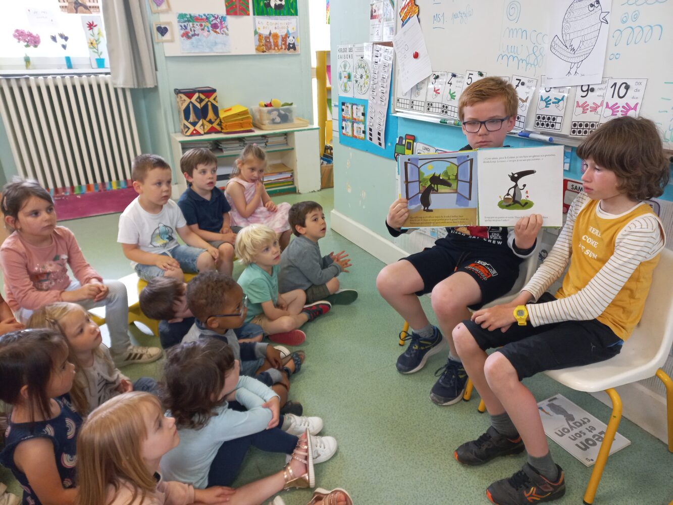 Diane et Augustine nous ont lu “Trois petits cochons”. Elyas et Emmanuel nous ont lu “Non pas dodo”. Judith et Zoé nous ont lu “Cornebidouille contre Cornebidouille”. Emma et Dounia nous ont lu “Léon et son crayon”. Judith et Aaron nous ont lu “Les musiciens de la Nouvelle Brême”. Timaël et Nolan nous ont lu “Le loup qui découvrait le pays des contes”.